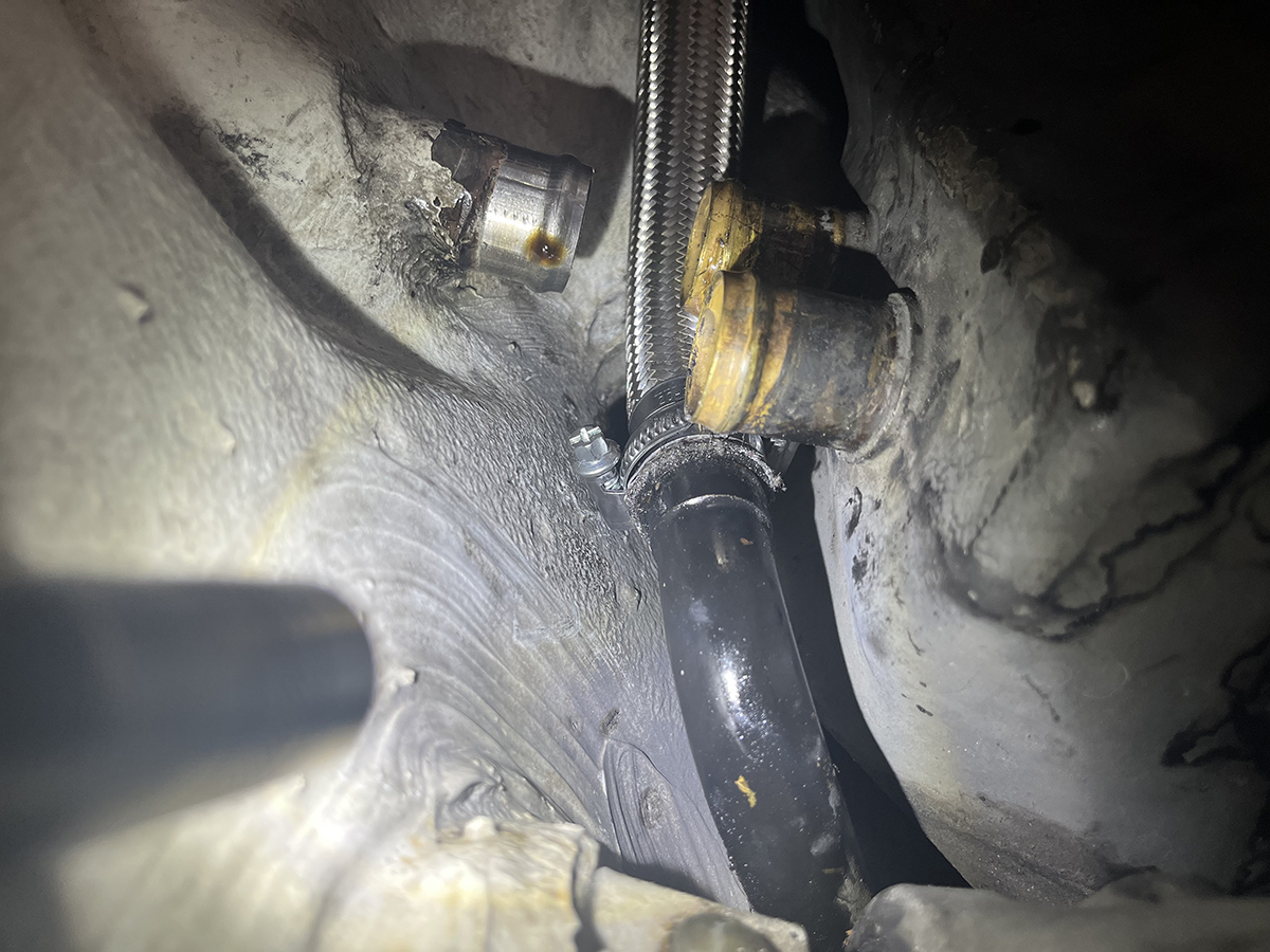 オイルクーラーからの戻りのホース、こちらのホースの口(締め付け部分)が堅くなってきていてオイル漏れの原因に。