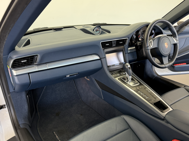 安心の正規ディーラー車!! 運転しやすい運転し易い右ハンドル&7速PDK搭載!! もちろん事故歴ありません!! 人気の外装色ホワイトにシングルチューブツインエグゾーストテールパイプ&純正19インチアルミホイールがお洒落なエクステリアを演出!! 心地よい禁煙の室内はハイセンスなヨッティングブルーレザーインテリア&セミパワーシートに便利な電動可倒式ミラー、運転操作をサポートするリアビューカメラや夜間の運転をサポートするキセノンヘッドライトも装備され、純正SDナビ・CD(ミュージックサーバー)・地デジ・ETC装備!! 先代モデルからダウンサイジングしたものの350psを発生する水平対向6気筒エンジン&スポーツクロノパッケージがストレスの無いドライビングを可能とし、アイドリングストップ機能も装備され燃費においても経済的でおすすめです!! 911をお探しの方は是非お急ぎ下さい!!