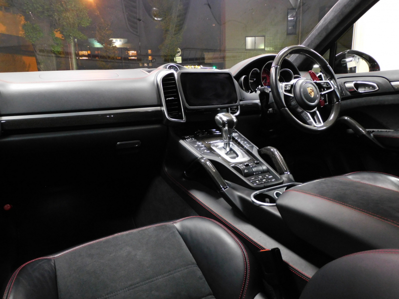 ポルシェ カイエン GTS 後期型 V6ツインターボ 右H正規D車 スポーツクロノ GTSインテリア カーボンインテリア 黒半革 Sヒーター 社外フローティングナビ&フリップダウンモニター Bカメラ&PAS クルコン&LCA LEDヘッドライト(PDLS+付) 赤メーターパネル エントリーD PASMエアサス スポエグ 赤キャリパー 純正21AW 禁煙