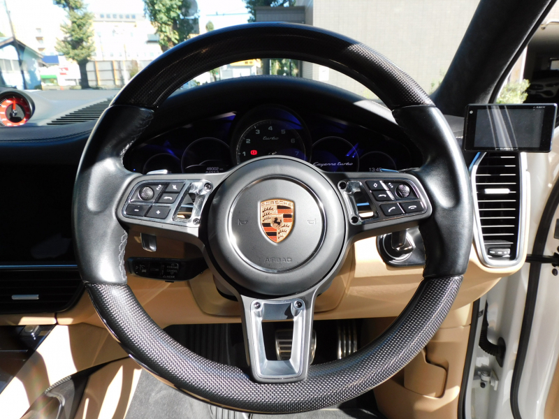 取説・記録簿付 もちろん事故歴御座いません!! 安心の右ハンドル&正規ディーラー車!! 綺麗な外装色ホワイト!! ターボ専用エクステリア&アルミニウムルーフレール(ブラック)&エクステリアパッケージに21インチカイエンターボデザインホイール&PSCB(ポルシェサーフェスコーテッドブレーキ)、LEDマトリックスヘッドライト(PDLSプラス付)が装備され迫力有るエクステリアを演出!! SUV特有の使用感はとても少なく心地よい禁煙の室内は開放感あるパノラミックルーフシステムにお洒落なブラック/ベージュツートンレザーインテリア&カーボンインテリアパッケージの組み合わせ!! 使い勝手の良い18way電動アダプティブスポーツシート(メモリー付)、快適なシートヒーター、カーボンGTスポーツステアリング(ヒーター付)が完備!! 高解像度12.3インチタッチスクリーンを採用し、より一層使い勝手の良くなったPCMナビ(ポルシェコミュニケーションマネジメントシステム)にインテリアを彩るアンビエントライト、希少なBurmesterハイエンドサラウンドサウンドシステム、エントリー&ドライブシステム、コンフォートアクセス、オートマチックテールゲート(バーチャルペダル付)、ソフトクローズドア、サラウンドビュー付パークアシストシステム、ACC(アダプティブクルーズコントロール)&LCA(レーンチェンジアシスト)が装備!! ドライビングプレジャーを掻き立てるスポーツクロノパッケージに新型4リッター V8ツインターボエンジン&PASM付アダプティブエアサスペンションが相まってストレスの無いドライビングを可能とします!! カイエンターボをお探しの方は是非お急ぎ下さい!!