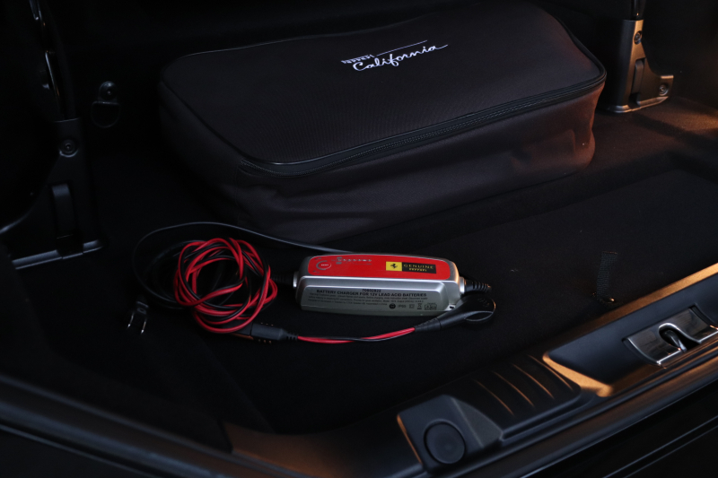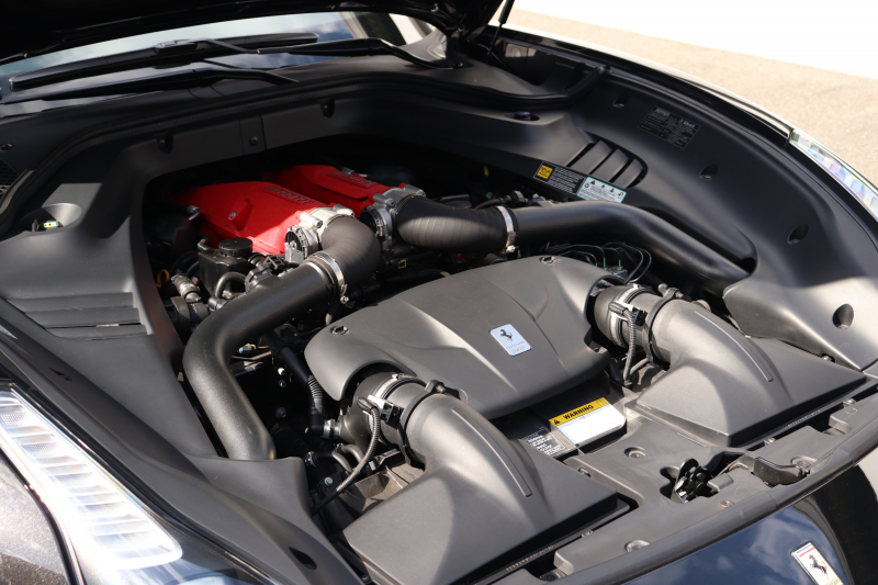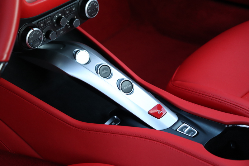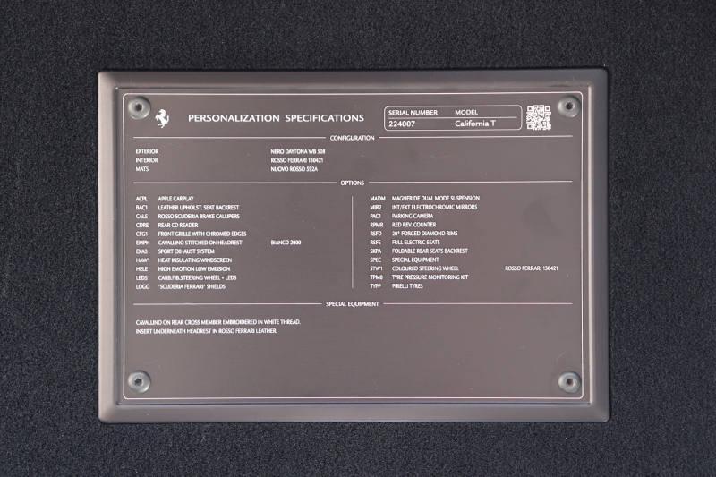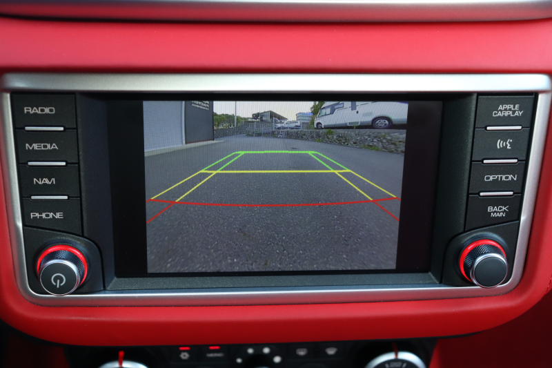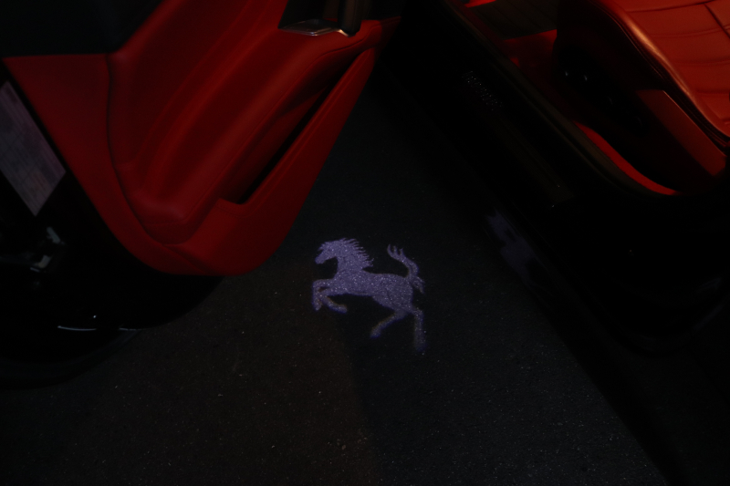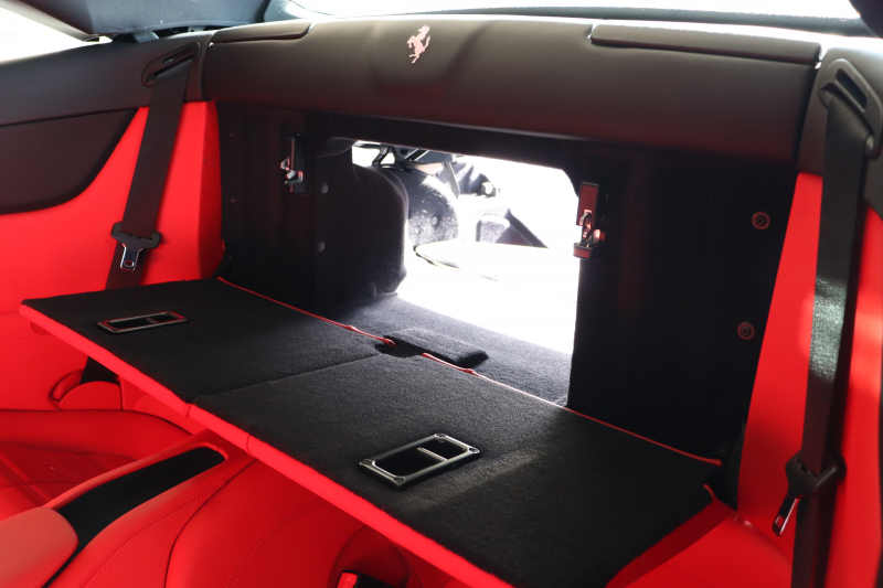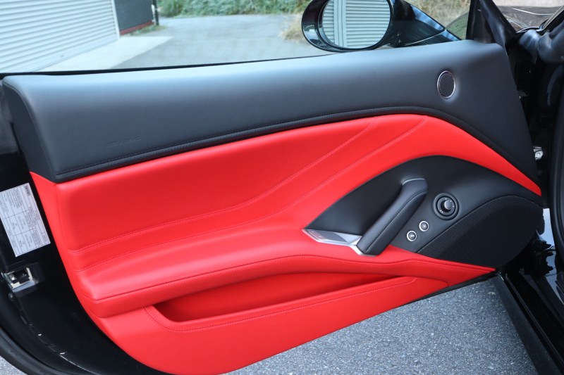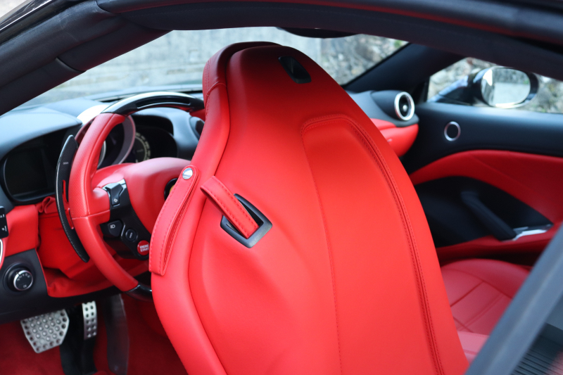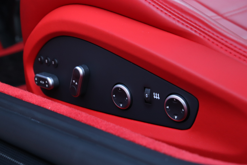 インテリアはROSSO FERRARI(カラーコード130421)で統一され、ヘッドレストの跳ね馬刺繍など細部のデザインもフェラーリらしいアクセント。フル電動シートや折りたたみ式リアシートバックレスト、カラーステアリング、LEDシフトインジケーター付きカーボンステアリングホイールにより機能性とデザイン性を両立しています。さらに、MagneRideデュアルモードサスペンションにより路面状況や走行モードに応じてサスペンションの硬さを最適化し、走りの純度を高めています。加えて、バックカメラ、TPMS、Apple CarPlay、ETC、ドラレコ、レーダー、充電器など、安全・快適装備も充実しています。