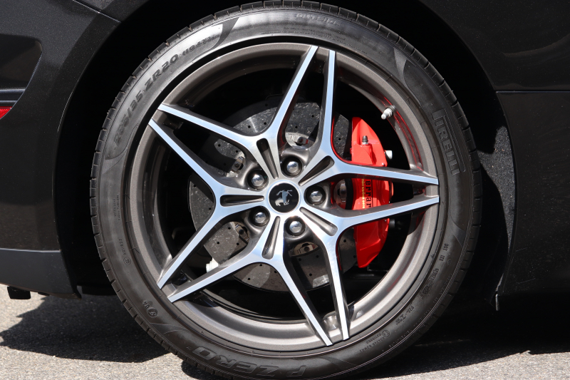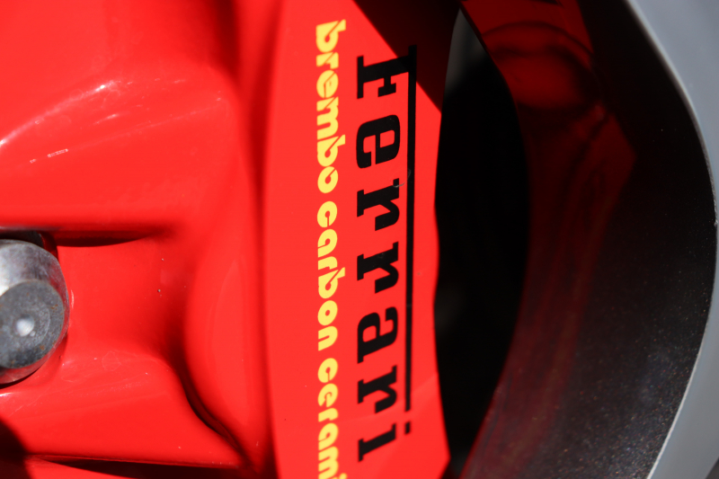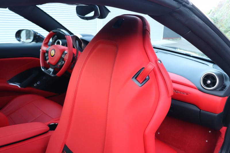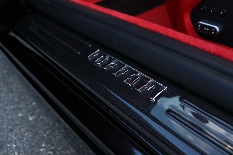 外装はNero Daytona WB508で、光の加減により表情を変える深みのあるブラックボディ。クローム仕上げのフロントグリル、ロッソ・スクーデリアブレーキキャリパーなど、フェラーリらしい精緻なディテールが随所に施されています。20インチ鍛造ダイヤモンドカットホイールと精悍なフォルムが相まって、停車中でも存在感を放ちます。スポーツエグゾーストは走りの高揚感を高めます。