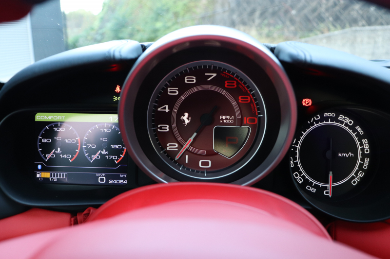 ネロ・デイトナの深いブラックにロッソ・フェラーリの鮮やかなレッドが映える、内外装の美しいコントラスト。このワンオーナーの2017年式フェラーリ カリフォルニアTは、視覚的な魅力と走りの楽しさ、日常での扱いやすさを高次元で両立させた一台です。一人のオーナー様によって新車時から丁寧に扱われ、整備記録簿9枚、スペアキー、取扱説明書完備で履歴も明確。走行距離は24,100kmで、経年を感じさせる部分はあるものの、全体として良好な状態を保っています。
