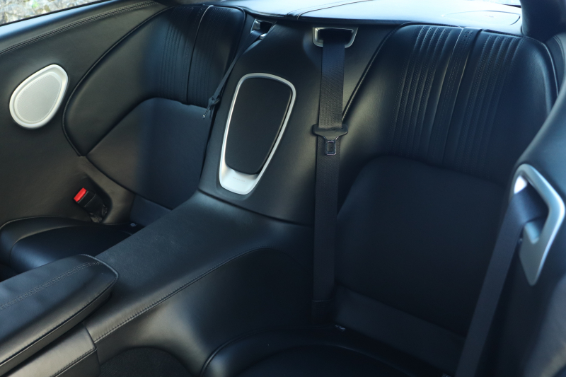 内装はピュアブラックレザーで統一された落ち着きある空間。年式を踏まえても良好な状態が保たれており、刺繍入りヘッドレストのアストンマーティンウィングスが、この車の背景と品格を静かに物語ります。