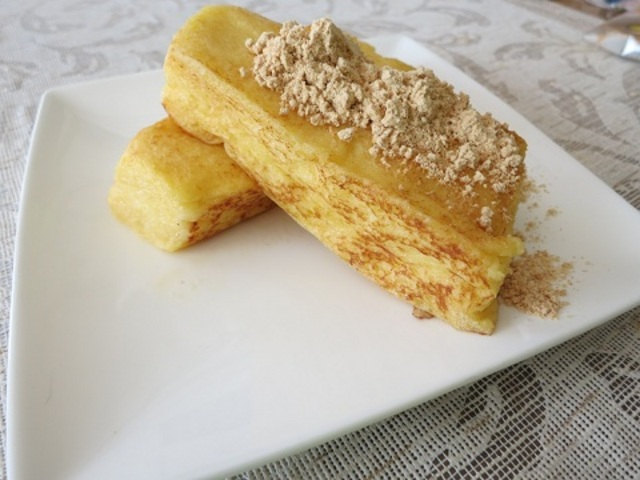 和三盆黄な粉を降りかけたカルピスバターのフレンチトーストの完成でsu