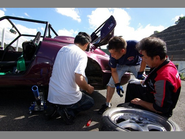 グリット上で最終の確認をする一番バッタークムホスポーツタイヤ輸入元樋口氏とカスタマー寺沢氏