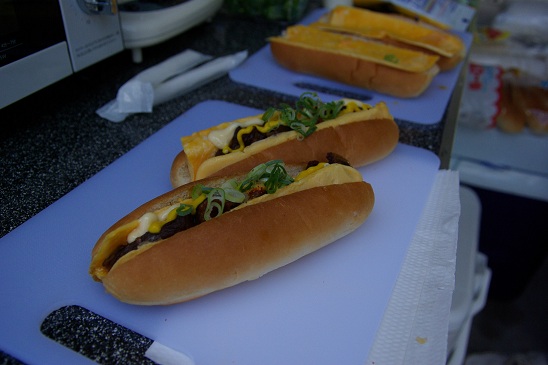 薬味には刻みねぎ、アクセントに七味、ソースにはマヨネーズとホットドッグ専用マスタード、パンには事前にバターを塗っておき、わざわざオーブントースターを持ち込み最後に焼いて完成、という、以外と手間をかけた料理です。