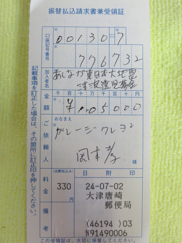 合計105000円を東日本大震災の義援金として本日あしなが育英会に振込してきました。