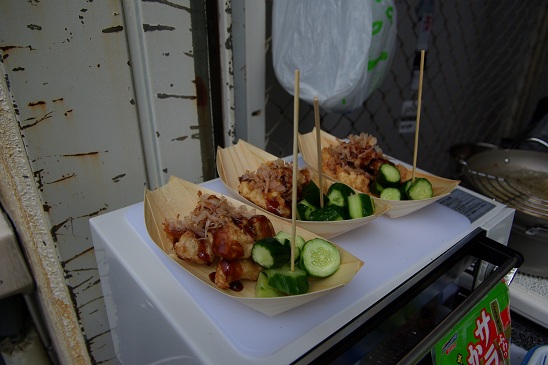 からあげたこ焼き仕立て、これまた私の中で、ありそうで世に出ていないもの、通常のから揚げと違うのは下味に塩こうじを加えて鶏肉にジューシーさを加えています。(前日からの仕込み)
