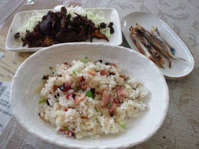 北海道物産展で買った黒い塩を塗りこんだベーコンと淡路産のたまねぎを使った焼き飯
