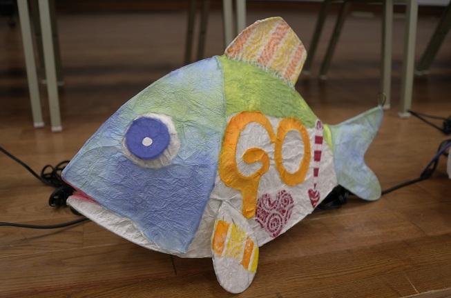 左右の写真を見ていただくとわかると思いますが、昨年から針金を曲げ和紙を貼り、立体のちょうちんのような物をつくります。